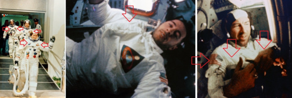 Но на фотографии s68—56532 Билла Андерса, эмблема на его правом плече не видна. На третьей фотографии НАСА s68—56533, слева, костюм Ловелла сильно изменился. Эмблема с флагом перемещается на правую руку, хотя раньше была на левой руке.