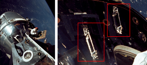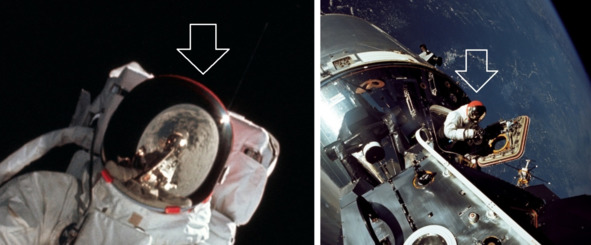 Слева фрагмент фотографии НАСА 2983 с подписью: «AS09-19-2983 (6 марта 1969 г.) Астронавт Рассел Л. Швейкарт, пилот лунного модуля, во время своей сверхзвуковой активности (EVA) на четвертый день полета на Землю на орбиту „Аполлон-9“ использует 70-мм камеру Hasselblad».