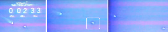 Чтобы скрыть истинные размеры головной части ракеты, уцелевшей от взрывов, американские обманщики дорисовали на этих кадрах изображение этой части ракеты. Размеры головной части ракеты сильно уменьшились. Поэтому при демонстрации таких кадров не наблюдается пульсация пламени, вылетающего из сопла двигателя разгонного блока ИСЗ «Тетра-А». Вместо этого пламени белая поверхность 2 и 3 ступеней, которые были дорисованы. Не во всех случаях это было сделано безупречно. Главное все равно осталось. Взрывы в районе 2 и 3 ступени ракеты «Сатурн-5», взрывы в районе 2 ступени ракеты «Сатурн-1В» были показаны американскими обманщиками в полетах «А-7», А-8», «А-10». В полете ракеты миссии «Аполлон-10», по причине облачности, такая демонстрация отсутствует. Далее кадры из фильма НАСА «Apollo 7».