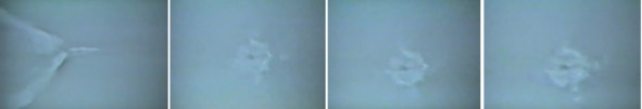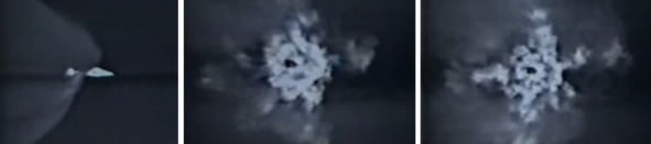 Хорошо наблюдается первая ступень, она не взрывается и в месте ее нахождения отсутствует пламя и задымления. Это событие происходит на высоте 65—70 км, по версии НАСА. При этом появление аномально большого расширения факела от работы двигателей первой ступени отсутствует. После серии взрывов, минимум их было три, головная ракета продолжает движение с ускорением. Но мерцающего пламени не наблюдается. Оно закрыто искусственно нанесенными белыми точками, белой краской. Головная часть ракеты дорисована.