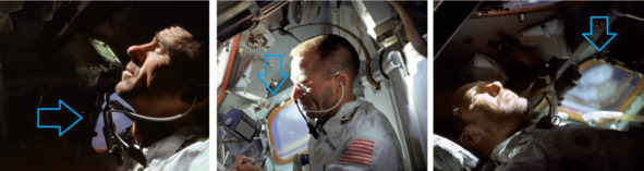 «Полет» «Аполлон-7» показал, что американские «космонавты не боялись смотреть в американском «космосе» на Солнце. За боковыми окнами видны участки голубого неба. В реальном космосе на Солнце смотреть не рекомендуется, солнечный свет там значительно ярче и ослепительней, чем на Земле. В настоящем космосе не может быть голубого неба. Фотографии НАСА 1584, 1586, 1596 демонстрируют смелость «космонавтов», они наблюдают Солнце без защитных очков, и за иллюминатором видно голубое небо.