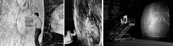 Фотографии НАСА показывают, как эти макеты выглядели. Для тренировок эти макеты были не нужны. Для комбинированных съемок такие макеты при создании художественного фильма про «полеты на Луну» были необходимы. Поверхность макета Луны была идеально детализирована благодаря точным картам, которые НАСА подготовило для программы «Аполлон». Фотография слева. Специалист из исследовательского центра Лэнгли в Хэмптоне, штат Вирджиния, наносит последние штрихи на поверхность «Луны». Фотография в центре. Симулятор прилунения на поверхность Луны «Lunar Orbit and Landing Approach», принадлежащий НАСА был создан по стоимости два миллиона долларов. Фотография справа. По тем временам это были большие деньги.