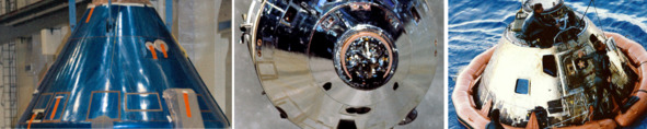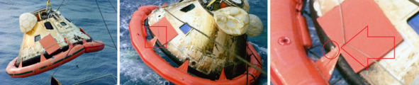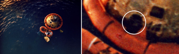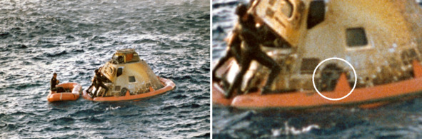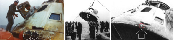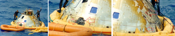 Приводнение КМ «Аполлон-8» и погрузка капсулы на борт морского судна демонстрируют фотографии НАСА s68—56304 ap8-S68—56217. Видимо обманщики понимали, что необычные следы обжига на боковой поверхности КМ правильной круглой формы могут вызвать подозрение и решили прикрыть эти отметины. Но белый предательский кружок спрятать не удалось. Он проявился посредине гари и копоти торца теплового щита. Его там не должно было быть, если бы эта капсула действительно прилетела с орбиты. Но все было совсем по другому.