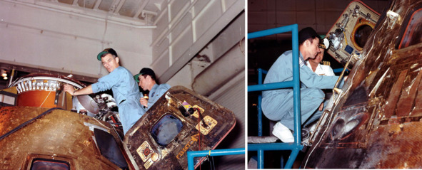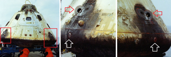 Потом заслонки все-таки пришлось убрать. Перед фотографом НАСА предстала знакомая картина изображение круглых светлых кружочков с правильными круглыми следами обжига на боковой поверхности КМ «А-8». В этот раз декораторы поленились убрать лишний майлар. Если бы эта капсула прилетела из космоса, то лоскуты материи, конечно бы сорвало все до единого.