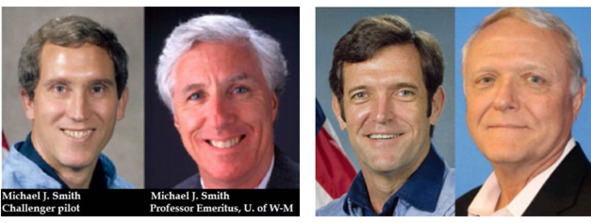 Слева, Джудит Арлен Резник, дальше ее «двойник» с той же фамилией и тем же именем. Справа, Шарон Криста МакОлифф, правее двойник Кристы, с той же фамилией и тем же именем.