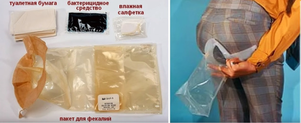 Авторов фильма НАСА тоже невозможно заподозрить в злом умысле против США. Вот что со слов авторов этого фильма и американского пропагандиста происходило на шаттле с космическим туалетом: 1) «Космонавту» США необходимо было очень точно выложить из прямой кишки свои отходы в центр унитаза, чуть левее или правее и возникали серьезные проблемы. В унитазе вращался ротор, который измельчал твердые отходы и принимал сюда же жидкие отходы, мочу. 2) В американском «унитазе» находился какой-то прицел, который при использовании унитаза надо было использовать размещение зада строго в центре унитаза. Самое интересное в этой «сказке» про точность дефекации от американских фантазеров это то, что кто-то поверил в реальность подобного описания конструкции. 3) При первом же полете произошло, со слов американских сказочников прогнозируемое событие, ротор разбросал мелкие части человеческих фекалий во все стороны. Если верить словам американского пропагандиста, этот случай был документально зарегистрирован и «космонавты» США с тех пор старались поменьше есть. 4) «Космонавты» США в этом шаттле снова вернулись к пакетикам, которые, якобы, использовались в программе «Аполлон». 5) «Космонавты» США, якобы, научились пользоваться «космическим туалетом», но им приходилось раздеваться догола, потому, что при дефекации они пачкали свою одежду, которую потом негде было постирать. 6) Американские «космонавты» привыкли к тому, что фекалии разлетались по кораблю. 7) Туалет часто ломался и «космонавты» пользовались пакетиками, как в программе «Аполлон». Ниже показаны фотографии «приспособления», которое, якобы, использовали американские «космонавты в программе «Аполлон». Оно представляло собой мешочек, который приклеивался при дефекации к заду «космонавта».