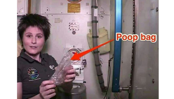 «Если туалет заполнится или забьется, приходится надевать резиновые перчатки и чистить его», – сказала Уитсон». Итальянский астронавт Европейского космического агентства Саманта Кристофоретти демонстрирует мешок для сбора твердых отходов». [8]