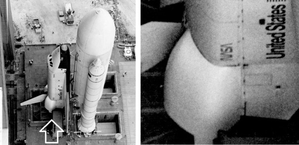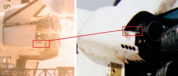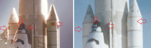 При сравнении фотографии элементов шаттла тоже обнаруживаются подозрительные моменты. Фотография НАСА 30459 демонстрирует взлет шаттла. Выделенный фрагмент в хвостовой части показывает наличие трех отверстий. Эти отверстия располагаются сверху на небольшом «пороге», слева от хвостовой части. Увеличенный фрагмент этой поверхности шаттла показывает их наличие в момент старта.
