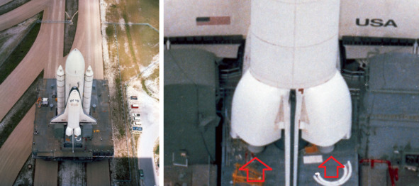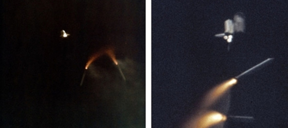 Фотографии НАСА, слева, подпись: «S81—33178 (12 апреля 1981 г.). Два твердотопливных ускорителя сброшены с космического шаттла „Колумбия“, поскольку успешная фаза запуска продолжается для первой пилотируемой космической миссии НАСА с 1975 года. Астронавты Джон У. и Роберт Л. Криппен на борту Колумбии». [11]