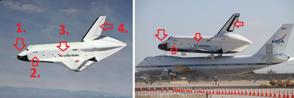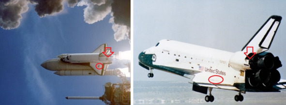 Фотографии не зеркальные. На левом крыле флаг США на двух фотографиях. Увеличенные фрагменты указанных фотографий НАСА демонстрирует наличие трех отверстий рядом с хвостовой частью шаттла, на площадке слева на фотографиях НАСА 30459, 30499. Расположение этих отверстий на конкретном месте фиксируется на старте шаттла.