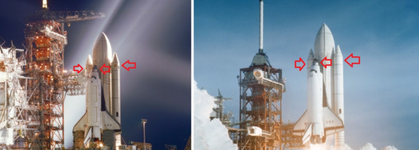 Можно объяснить такие изменения тем, что изменялись накладные конструкции, прямоугольники и круги. Хотя очень трудно представить, каким образом специалисты НАСА изменяли накладные прямоугольники и круги, при такой конфигурации комплекса. Снимать и устанавливать такие «накладки» чрезвычайно сложно. Возвращать обратно такую махину в ангар, чтобы поменять накладные поверхности, это даже для американцев будет слишком! Как минимум, такие изменения внешнего вида шаттла и ускорителей настораживают! Особенно после того, как обнаружились близнецы «Энтерпрайза».