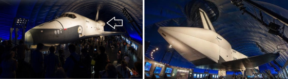 Подпись к фотографии справа: «Поскольку коммерческий космический полет становится все более правдоподобным, невероятно считать, что осталось только четыре шаттла НАСА. „Энтерпрайз“, который сейчас находится в Музее „Бесстрашное море, воздух и космос“, был прототипом шаттла, который начал космические исследования в 1977 году». [10] На стартовой площадке этот аппарат США в хвостовой части имел некое подобие ракетных двигателей.