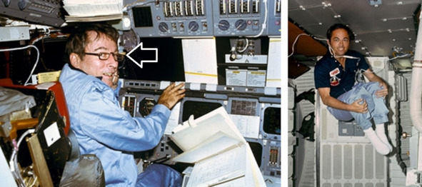Такие фотографии успешно можно сделать в самолете «нулевой гравитации. Обращает на себя внимание состояние зрения Янга. Он носит очки. Только американцы набирали в космонавты людей с плохим зрением и серьезными проблемами зрения.