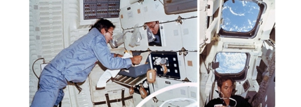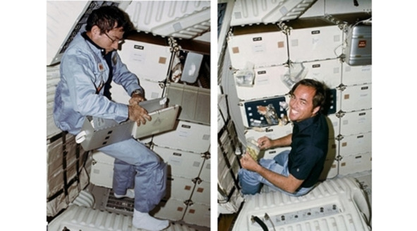 Демонстрация невесомости на фотографиях НАСА s81—30419, s81—30420, слева направо. [13], [14]