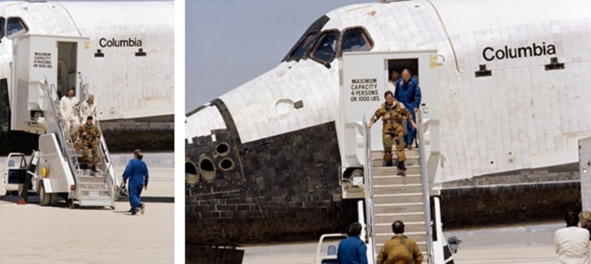 Подпись под фотографией НАСА, справа, приземление шаттла: «S81—30744 (14 апреля 1981 года) Задние колеса космического челнока „Колумбия“ собираются приземлиться на озере Роджерс (сухое русло) на базе ВВС Эдвардс в южной Калифорнии, чтобы успешно завершить пребывание в космосе через два дня. Астронавты Джон У. Янг, командир STS-1, и Роберт Л. Криппен, пилот, находятся на борту транспортного средства. Миссия ознаменовала первый полет НАСА, завершившийся посадкой на колесах, и представляет собой начало новой эры космических полетов». [7]
