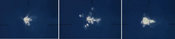 Съемки с земли показывают иную картинку. Наблюдатели наблюдали в специальные телескопы голубой фон неба, и две отдельные вспышки. Сначала произошел большой взрыв, после того, как инверсионный след прервался.