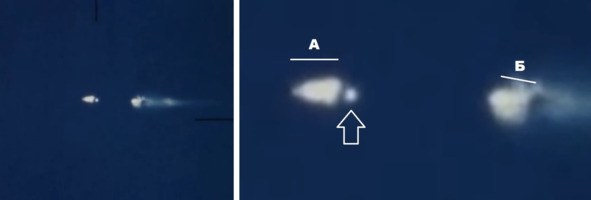 Соотношение отрезка «А» (длина головной части) к отрезку «В» (длина первой ступени) с учетом проекционного искажения составит около 1,4. Это составляет приблизительно одинаковое отношение длины головной части без иглы САС, 34,5 (35) метров, к длине первой ступени, 25,5 метра. Все это сочетается с ослепительной белизной головной части ракеты, которая прошла через облако взрыва, и не покрылась копотью.