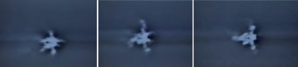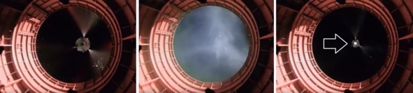 Далее следуют кадры на черном фоне, где показано невидимое «водородное пламя» и отстрел обтекателя вместе с САС. Очень сомнительно, что такая смена фона с голубого неба на черное небо, была вызвана с помощью телескопа с большим увеличением. Такой телескоп действительно позволяет в дневное время суток увидеть черное, звездное небо. В этом случае, на кадрах проявилась бы россыпь звезд на черном небе. И при большом увеличении очень трудно удержать в объективе движущийся объект. Такое изображение все время вибрирует и пытается «выскочить» из поля зрения. В этом эпизоде с черным небом и ярким пламенем, предположительно это двигатель головной части ракеты после серии вспышек, изображение хорошо держится в кадре и не выпадает за рамки.