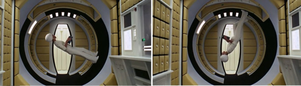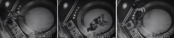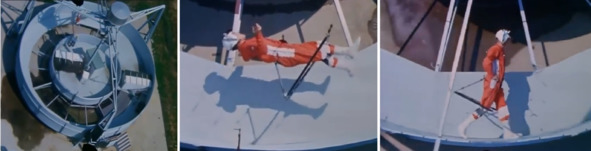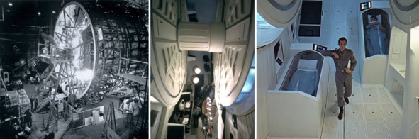 Слева колесо, с помощью которого в фильме снимали бег по кругу внутри цилиндра. В этой конструкции по задумке авторов находилась сама станция. Колесо вращалось в «космосе» и создавало тем самым искусственную гравитацию. В центре и справа кадры интерьера «космической» станции. Человек в космосе ходит по внутренней стороне цилиндра. Цилиндр, якобы, вращается по сюжету фильма. Обыватель же воспринял эти сцены как некое знание о том, что в невесомости можно ходить и бегать по кругу в цилиндре, в том числе вниз головой.