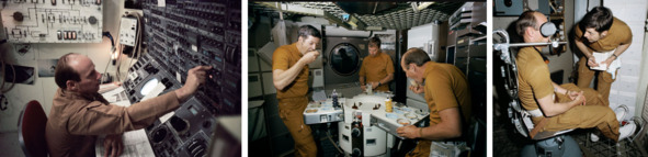 Фотография НАСА, в центре: «S73—20236 (1 марта 1973 г.). Три члена основного экипажа первой пилотируемой миссии Скайлэб обедают на специально приготовленной космической пище Скайлэба в каюте комнаты экипажа инструктора Орбитальной мастерской Скайлэб (OWS) во время тренировки Скайлэб в космическом центре Джонсона». [8]