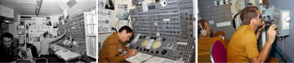 Фотография НАСА, слева: «S73—28412 (февраль 1973 г.). Три члена основного экипажа третьей из трех запланированных пилотируемых миссий Скайлэба (Скайлэб 4) проходят предполетную подготовку Скайлэба в Центре обучения и симуляции миссии в Космическом центре Джонсона. Астронавт Джеральд П. Карр (справа), командир Skylab 4, сидит за симулятором, который представляет собой пульт управления и индикации телескопического крепления Apollo, расположенного в адаптере множественной стыковки космической станции». [13]