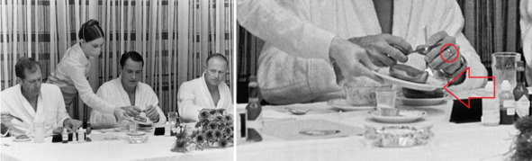 Американский космонавт поедает жареное мясо и жареный хлеб. В космос, где происходит опухание и отеки конечностей, в том числе пальцев, кольца носить проблематично. Но американцы об этом не знали. Не было у них никаких понятий о необходимости очистительных клизмах перед полетом, о системе диетического питания, о проблемах питания в космосе. Перед реальным, космическим полетом нагружать пищеварительную систему большим количеством еды смертельно опасно. Реальный космонавт может запросто захлебнуться в собственной рвотной массе. Это произошло с космонавтом Германом Титовым.