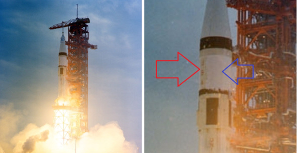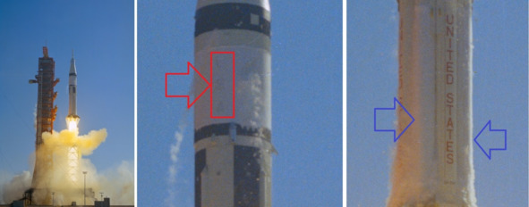Ракета «Сатурн-1В» на старте в американском цирке «Скайлэб-4». Фотография НАСА skylab4-s73—37287. На этот раз слой инея значительно шире. Но это иней, а не слой льда. Просматривается надпись на второй ступени, которая выделена красным прямоугольником и красным указателем. Синие указатели показывают степень обледенения баков с жидким кислородом на первой ступени. Разница между обледенением и слоем инея очевидна.