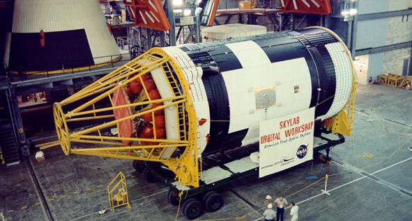 Как американская станция «Скайлэб» выглядела на Земле в сборочных цехах? Это демонстрирует следующая фотография НАСА: KSC-72PC-489. Сопровождающей надписи к этой фотографии в архивных материалах НАСА почему-то нет. Но судя по окружающим объектам и плакату, который висит на этой конструкции, американцы показали станцию «Скайлэб» в сборочном цехе, на самом космодроме.