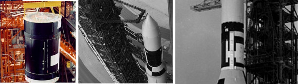 Фотографии НАСА, слева, направо: KSC-72PC-493; KSC-73P-245; KSC-73P-313. Станция «Скайлэб» в сборочном цехе и после установки на ракете.