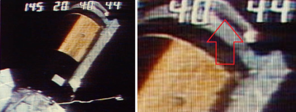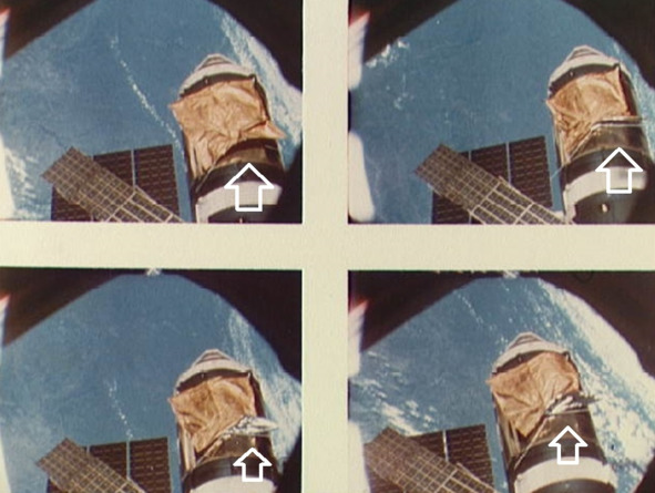 Пока это не аномальное явление, обшивка утеряна, якобы, в результате аварийного срыва части покрытия белого цвета. Теперь внимательно необходимо посмотреть на кадр из фильма НАСА, на сайте НАСА, кадр под номером S73—26738. Появление золотистой, зеркальной поверхности вместо белой поверхности станции, объяснялась аварией на «станции». Но изменение заглушки с красного цвета, на белый цвет объяснить сложнее.