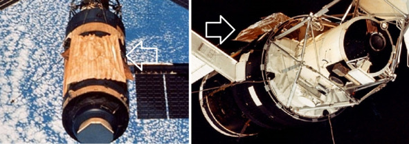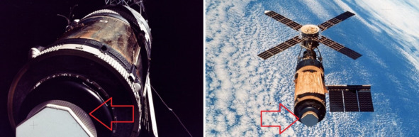 На других фотографиях НАСА: SL2-04-265, SL4-143-4706, слева направо, эта часть станции окрашена в белый цвет. В сборочном цехе, заглушка была красного цвета. Зеркальная поверхность на фотографии слева теперь выглядит обгорелой. Солнечные батареи на поверхности «станции» из-за аварии не раскрылись. На фотографии справа солнечные батареи «станции» только с одной стороны.