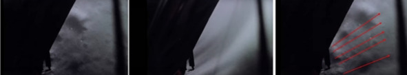 На кадре справа стрелками показано направления разлета грунта. Источник давления, откуда идет воздействие на грунт, находится слева от иллюминатора, внизу. Кадры получены из фильма НАСА «Landing on the Moon: July 20, 1969». [4]