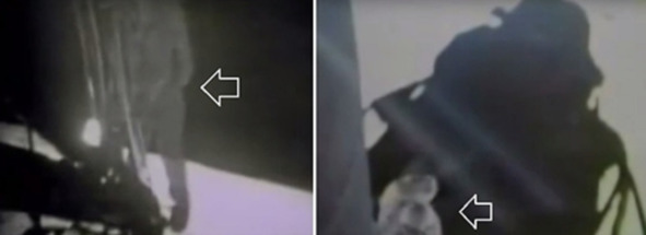Кадры из фильма «Высадка на Луну. Аполлон-11». Реальные кадры», были получены ЦУП в Хьюстоне и выведены на большой экран. Кадр «0:41» и далее показывает, как кто-то сменил направление съемки телекамеры, которая, согласно сказкам НАСА, находилась слева от лестницы «ЛМ». Началась сразу же «трансляция» лунной прогулки Нейла. Олдрин, по версии американских сказочников, находился в «ЛМ» и не мог изменить направление съемки телекамеры. Системы удаленного управления этой телекамерой американские фальсификаторы не декларировали. Включить телекамеру и поменять направление съемки Нейл не мог, он в этот момент спускался по лестнице. Второе изменение направление съемки произошло на кадре «1:51». Нейл (или его дублер) в этот момент, левой рукой держался за лестницу, правая рука не могла изменить направление съемки с помощью приводов или веревки.