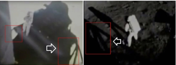 Кадры «трансляции» показывают, что форма тени от стойки при съемках из кабины в момент выхода на «Луну» отличается от тени этой же стойки, через какое то время. Изменилось направление освещения «Солнца». При этом надо учесть, что на реальной Луне тени так за 3—4 часа измениться не могли. Лунный «день» длится больше, чем земной день. 14 земных суток это один день на Луне. Организаторы шоу не учли при освещении киноплощадки, что на реальной Луне направление освещения Солнца за несколько часов изменялось малозаметно.