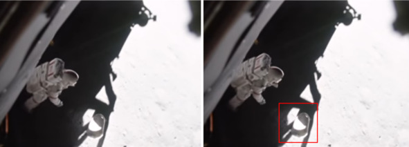 Обращает внимание другой аномальный факт. На кадрах хроники «лунной трансляции» с телекамеры около лестницы скафандр «космонавта» не подсвечен «лунным грунтом» или каким-то иным источником рассеиваемого света. Поэтому фигурка «космонавта» выглядит темной.