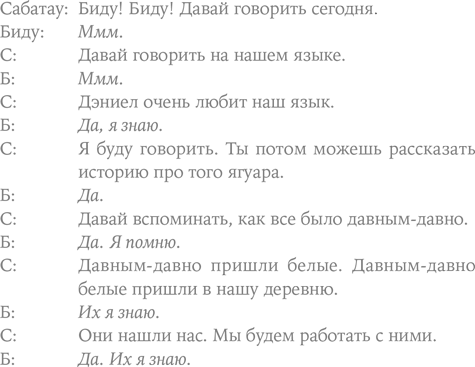 И хотя я был за тысячу километров от дома, обливался по?том и постоянно отмахивался от мух-кровососов и ос, когда через 45 минут Сабатау и Биду завершили беседу, я чуть не плакал. Я сердечно поблагодарил их за подаренное мне лингвистическое сокровище. В ответ они улыбнулись и отправились на охоту, захватив свои духовые трубки и отравленные дротики. Оставшись в одиночестве, я принялся расшифровывать запись (записывать ее во всех подробностях с помощью фонетических символов), переводить и анализировать. После двух дней кропотливого труда, приведя заметки в «презентабельный вид», я передал их вместе с аудиозаписями и целой кипой аналитических материалов аспиранту из Манчестерского университета (Англия), который сопровождал меня в экспедиции на Амазонку.