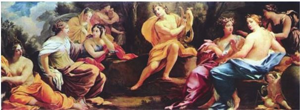 Олимпийские Музы классической мифологии являются дочерями Зевса и обитают на Геликоне. Отметим, что в эпоху эллинизма они воспринимались древними греками как символические образы: Эрато – Муза лирической поэзии с лирой в руках; Эвтерпа с флейтой сопровождает лирическую песнь; Каллиопа – Муза эпической поэзии и знания со свитком и палочкой для письма; Клио – Муза истории с теми же атрибутами; Мельпомена – Муза трагедии с трагической маской и венком из плюща; Полигимния – Муза серьёзной гимнической поэзии; Терпсихора – Муза танца с лирой и плектром (приспособлением для извлечения звуков); Талия – Муза комедии с комической маской; Урания – Муза астрономии с небесным сводом и циркулем. Музы подчиняются богу искусств Аполлону, получившему имя Мусагет.