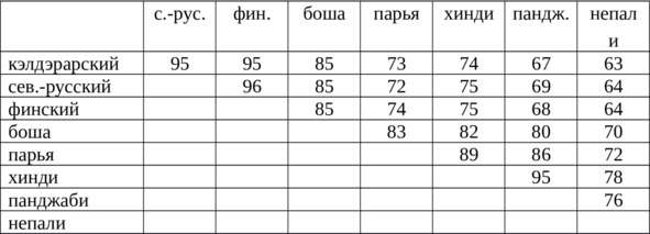 Неожиданные результаты были получены и автором данной статьи по индоарийским языкам, в частности, относительно места среди них цыганского языка (языков). Согласно традиционным классификациям, цыганский язык многими исследователями a priori относится к центральным индоарийским языкам и считается близким к хинди [23]. Однако же глоттохронологический анализ недвусмысленно указывает на его особое положение внутри индоарийской языковой группы (подсчеты проводились по методике Старостина) [24] (см. таблицу выше на данной странице).
