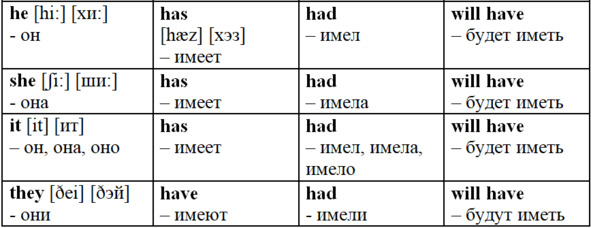 Здесь мы будем рассматривать спряжение глагола to have [tu: h?v] [ту: хэв] иметь в неопределенном времени. Определения настоящего, прошлого и будущего неопределенного времени дано в предыдущей Теме. Приведем здесь таблицу спряжения глагола to have в неопределенном времени: