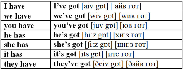В настоящем неопределенном (простом) времени вместо глагола to have часто в разговорной речи употребляется выражение have got или has got (в зависимости от используемого местоимения). Глагол got [g?t] [гот] переводится как получил (это прошедшее время глагола to get [get] [гет] – получать). В разговорной речи используются сокращения: