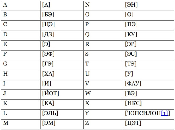 В немецкой письменной речи используется латинский алфавит. Буквы латинского алфавита имеют своё немецкое название, приведённое в квадратных скобках: