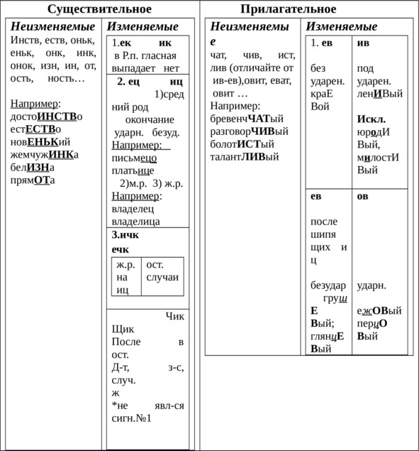 ВНИМАНИЕ! В начальных классах изучайте неизменяемые суффиксы, а изменяемые только по мере изучения в школе. Не забывайте, что говорим мы о «сигнале №1» – безударной гласной в разных частях слов.