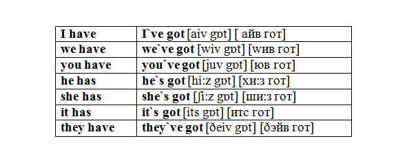 В настоящем неопределенном времени вместо глагола to have часто в разговорной речи употребляется выражение have got или has got (в зависимости от используемого местоимения). Глагол got [g?t] [гот] переводится как получил (это прошедшее время глагола to get [get] [гет] – получать). В разговорной речи используются сокращения: