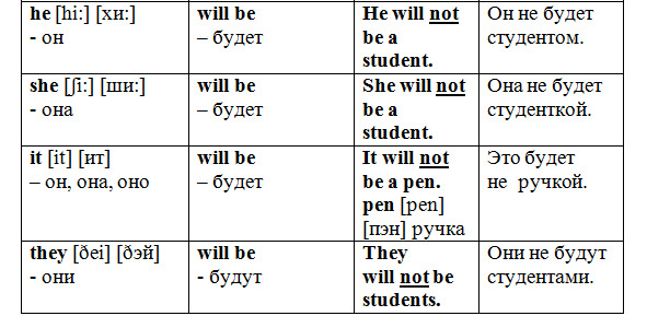 Приведем здесь таблицы примеров формирования отрицательных предложений с глаголом to be в настоящем, прошлом и будущем неопределенном времени. Определение неопределенных времен дано в 7 уроке.