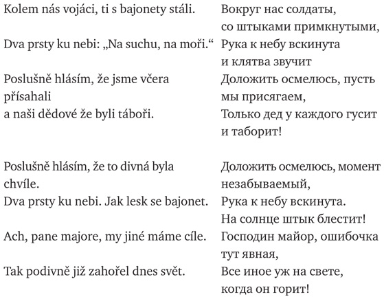 А еще забавно, что это «осмелюсь доложить», в романе буквально превратившееся в навязчивый символ как уставного идиотизма, так и собственного швейковского, в киевском стихотворении Гашека «После присяги чешского солдата в Австрии» (Po p??saze ?esk?ho vojaka v Rakousu), опубликованном в «Календаре журнала Чехослован на 1917 год» (Kalend?? Velk? ?echoslovan pro rok 1917), рефреном повторяется совсем иначе, как язвительный и открытый вызов, то есть безо всяких дураков. Вот, например, такой зачин (SB 2016):