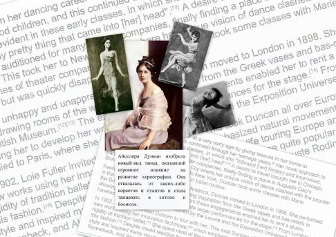 Айседора Дункан изобрела новый вид танца, оказавший огромное влияние на развитие хореографии. Она отказалась от каких-либо корсетов и пуантов и стала танцевать в хитоне и босиком. «Американская босоножка» вызывала восхищение своим талантом, своим неистребимым желанием дать искусству танца новые идеи, новые возможности. Приклоняясь перед искусством Древней Эллады, она черпала в нем свое вдохновение. Ее движения были красивы и естественны, женственны и грациозны. Своим танцем Айседора создавала гармонию души и тела, выражала свое внутреннее переживание на музыку Бетховена, Шопена, Моцарта, Мендельсона… Естественность, простота, а главное – духовная свобода – вот что было в ее танце. Символом свободы была и сама артистка. Айседора свободно высказывала свои взгляды, носила любые одежды, любила и жила без оглядки на догмы и условности. С ее именем связаны изменения в моде и в стиле одежды. Под влиянием ее танца изменился классический балет. Он возродился, использовав новые идеи Дункан.