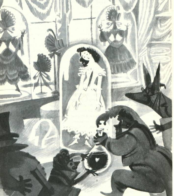 А когда он накрыл куклу хрустальным колпаком, та рассердилась — и чу прыгать, кричать, стучать об колпак, так и рвется из-под него.