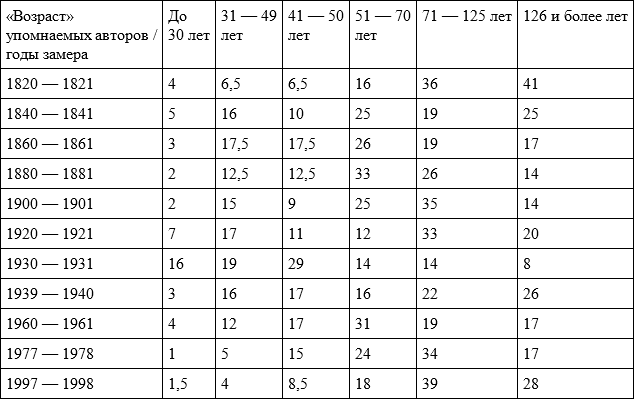 О стабильности общей нормативной рамки оценок и классикалистской, канонизирующей ориентации рецензентов свидетельствуют и данные о «возрасте» упоминаемых писателей. Современников, молодых авторов рецензенты почти не упоминают. Среди упоминаемых писателей лица в возрасте до 40 лет составляют всего 5,5 %. Это самый низкий показатель за все замеры, даже в классикалистские 1977–1978 гг. их было 6 %, в другие же периоды эта доля была гораздо выше (например, в 1860–1861 гг. — 20,5 %, в 1920–1921 гг. — 24 %, в 1930–1931 гг. — 35 %). Среди упоминаемых имен преобладают авторы в символическом возрасте «классиков»: так, на этот раз писатели старше 70 лет составляют две трети всего корпуса упоминаемых авторов — 67 %. Выше эта доля была только один раз, в 1820–1821 гг., когда во многом еще были живы нормы литературного классицизма и демонстративного чинопочитания.