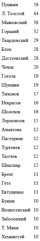 Об отсутствии заметных переломов, общей инерционности системы координат рецензентов, как ни парадоксально, говорит общий характер сдвигов в списках лидеров упоминаний. Сравним новейшие данные и данные двадцатилетней давности. В 1977–1978 гг. объем, границы, структура системы литературных авторитетов были весьма стабилизированы (ситуация официального застоя вкупе с запретом на упоминания неугодных): отсюда очень высокий уровень согласия вокруг небольшого набора ведущих имен, сравнительно небольшие количественные различия между ними. В целом была весьма ощутима ориентация на литературных предшественников, апелляция же к современности, напротив, была выражена слабо, а ретроспективистские тенденции сравнительно с предшествовавшим периодом 1960–1961 гг. заметно усилились. Литературная культура в тот период была сконцентрирована на отечественном прошлом. Об этом наглядно свидетельствует состав группы лидеров (указано число упоминаний в рецензиях 1977–1978 гг.):