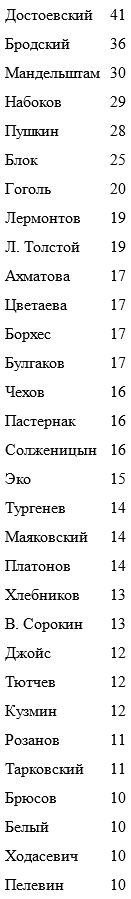 (в процентах к совокупности всех писателей, упомянутых в данном замере)